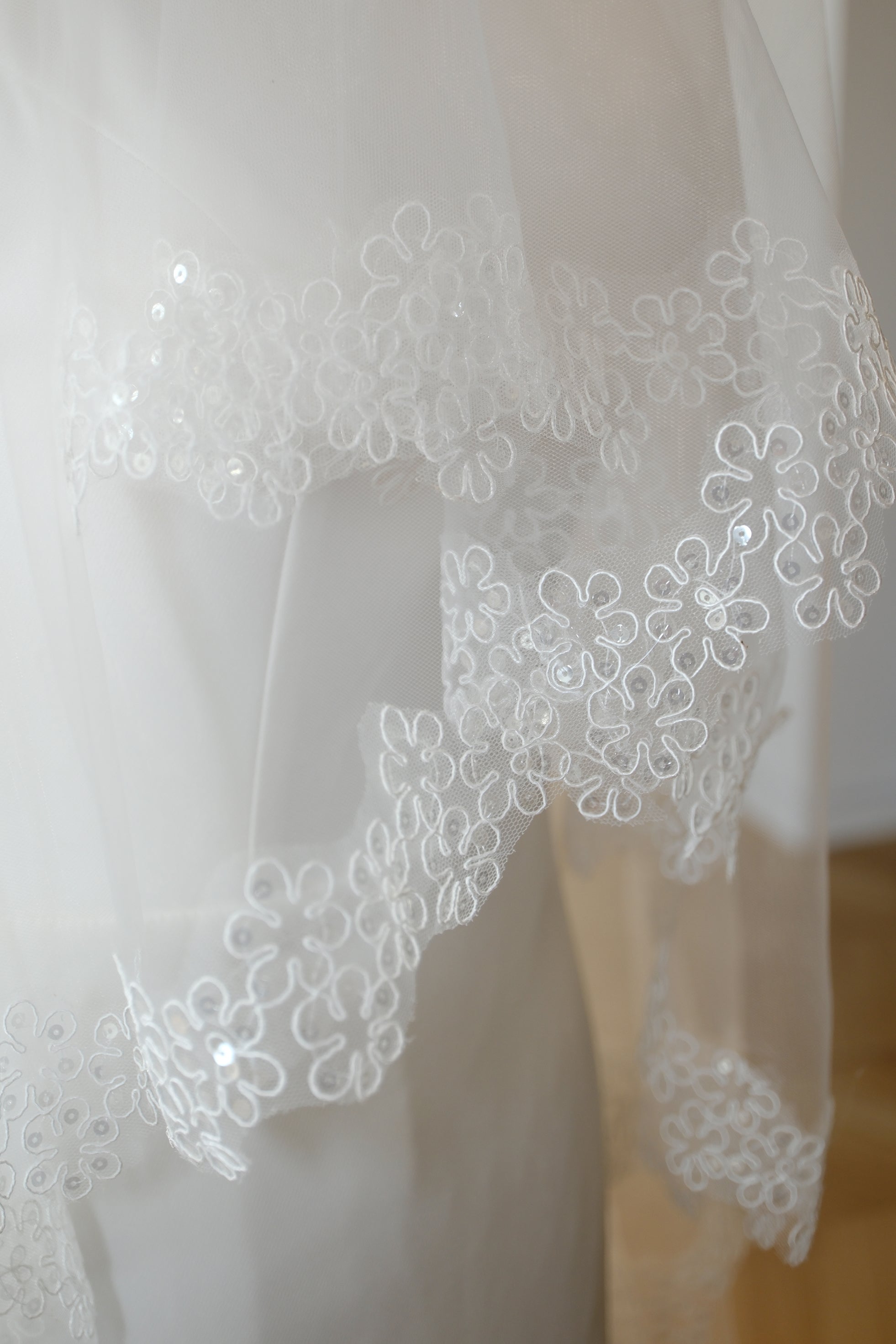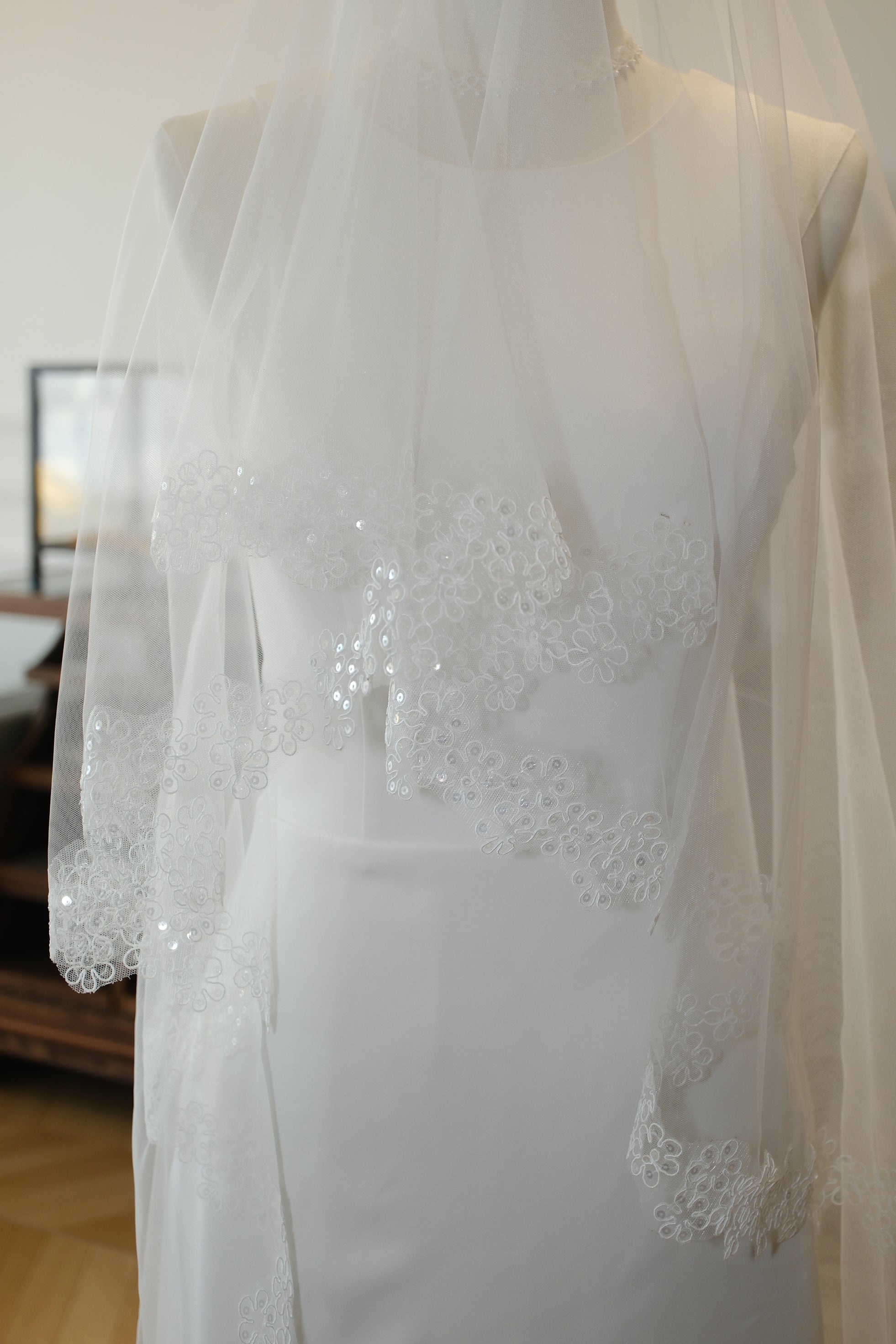 • We are delighted to accept custom orders to accommodate your individual tastes and needs. Add beautiful, personalised embroidery to your veil to make it a one-of-a-kind and really get your guests talking! It’s now possible to add your couple initials for a veil. Include the date underneath to commemorate your special day. Or perhaps you’d prefer to add your full names or a longer message, please do not hesitate to get in touch with us. We will work together to transform your vision into a tangible reality. Our commitment is to provide you with the utmost flexibility and creativity, ensuring that your accessory is truly one-of-a-kind.