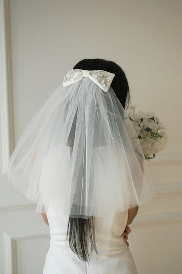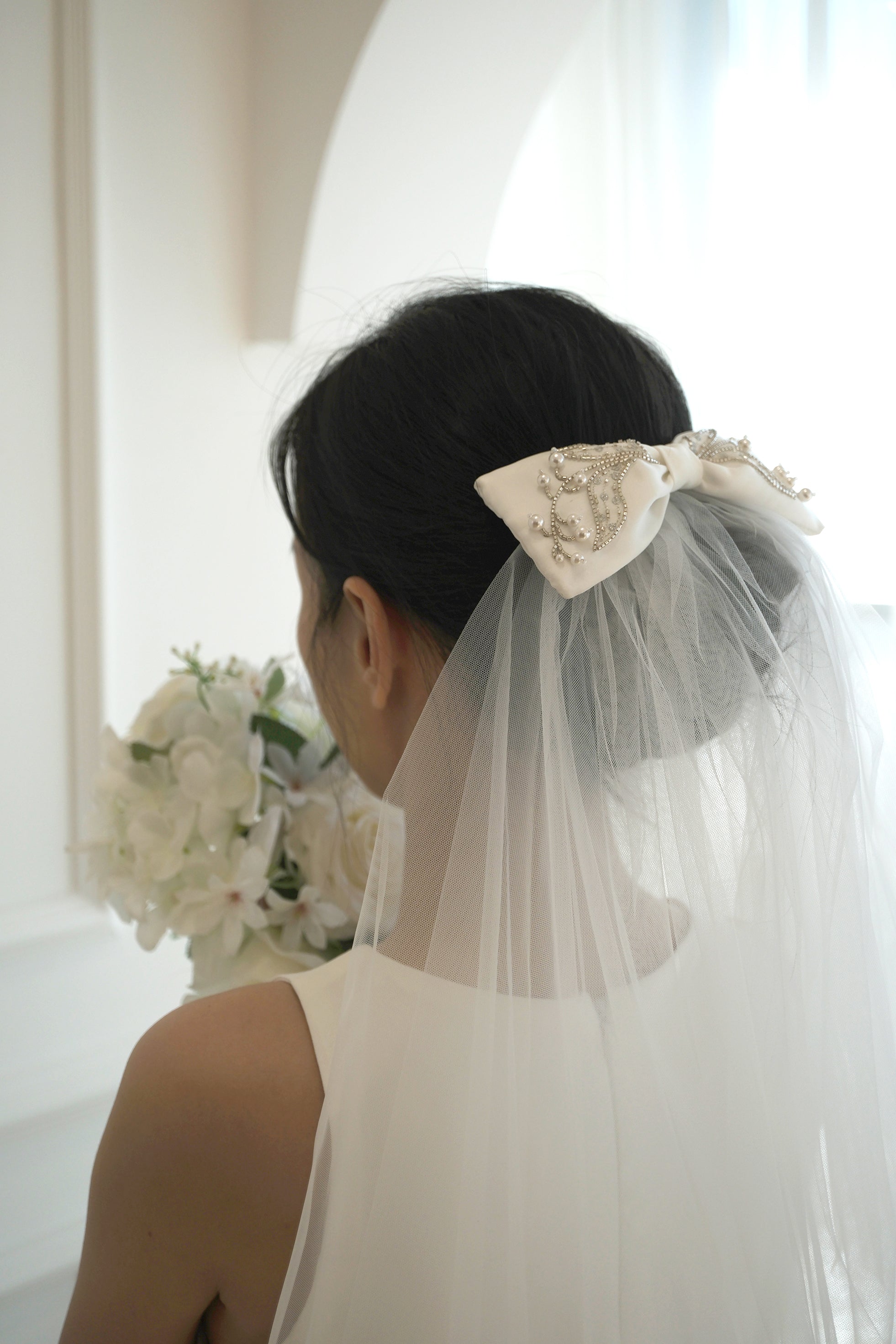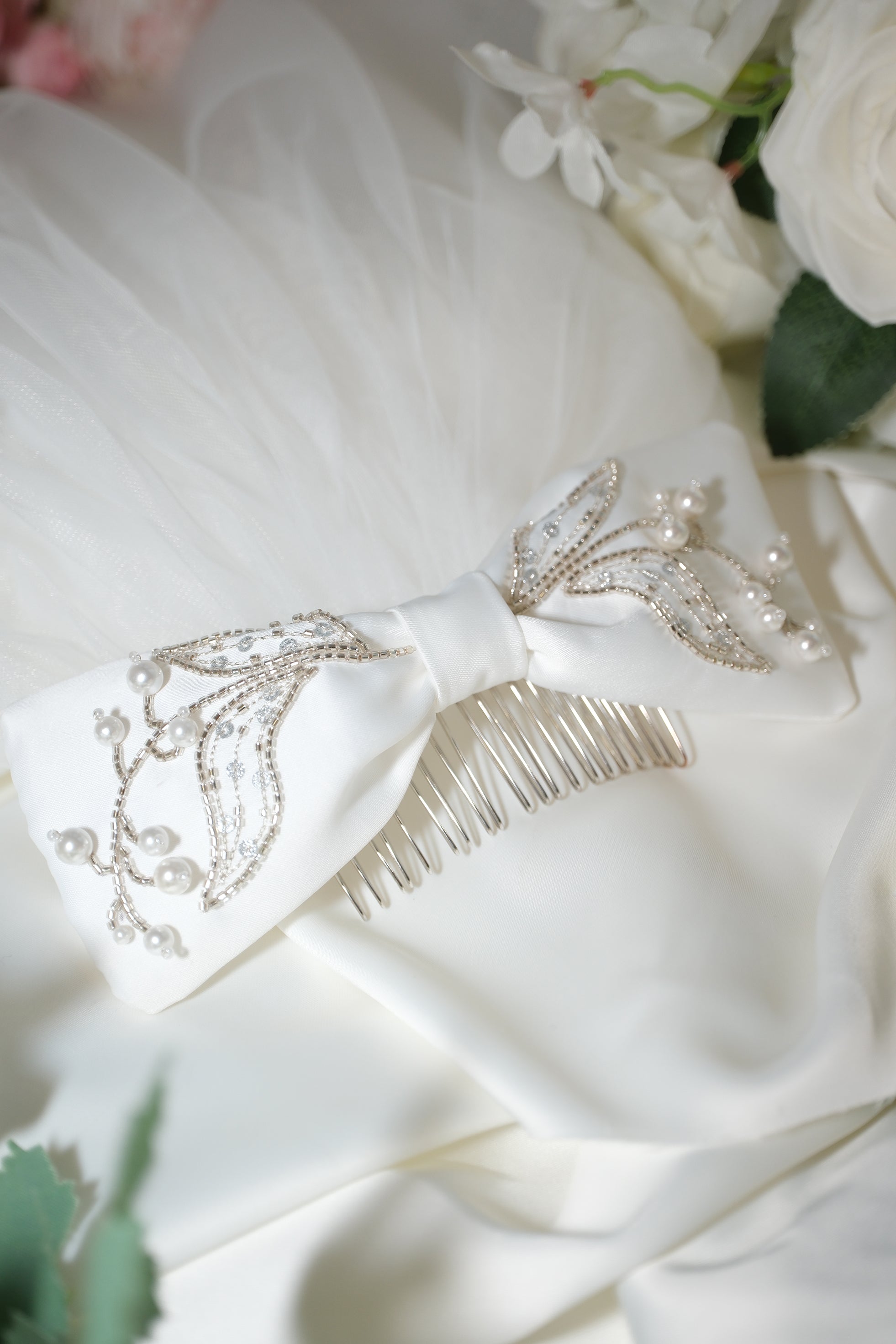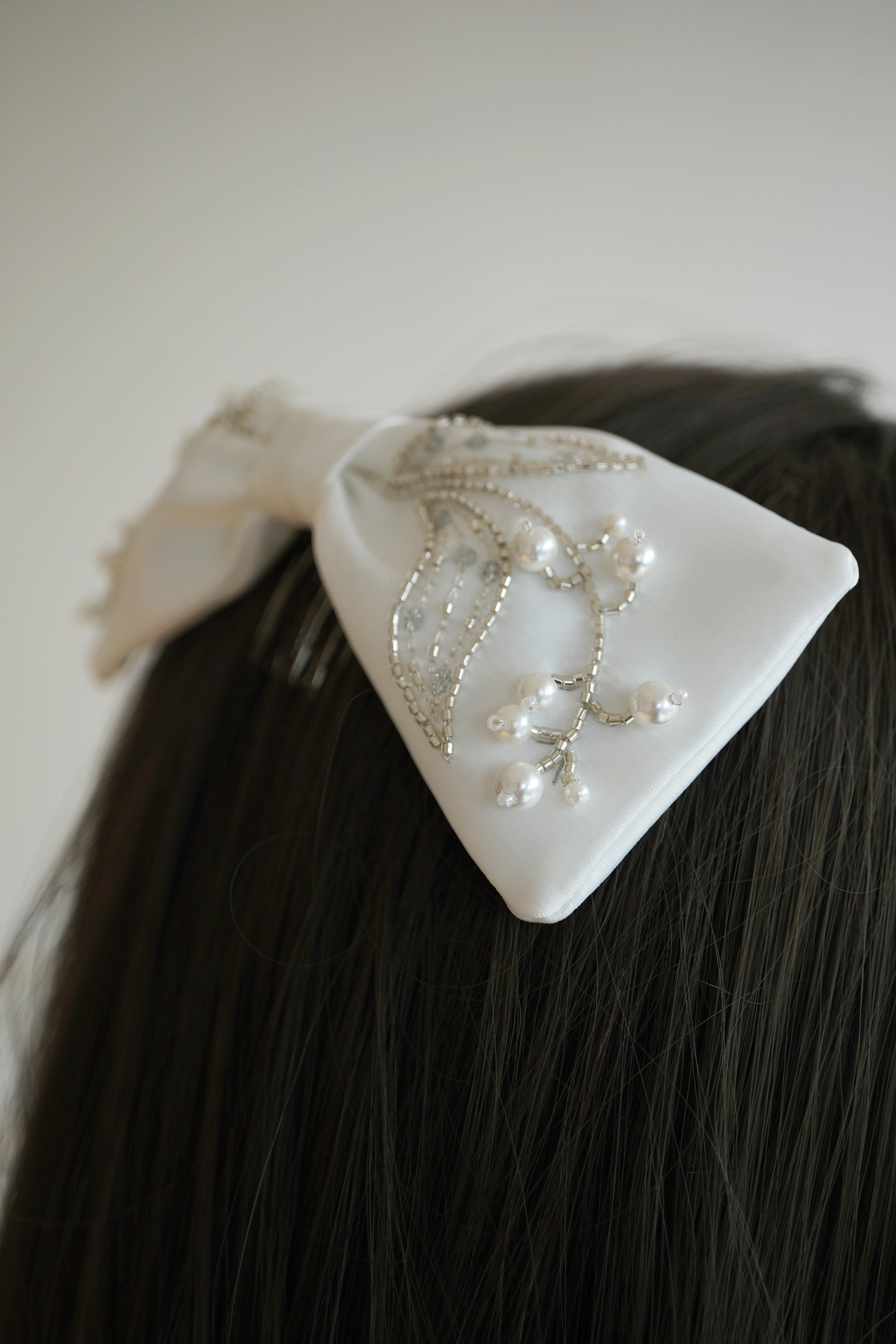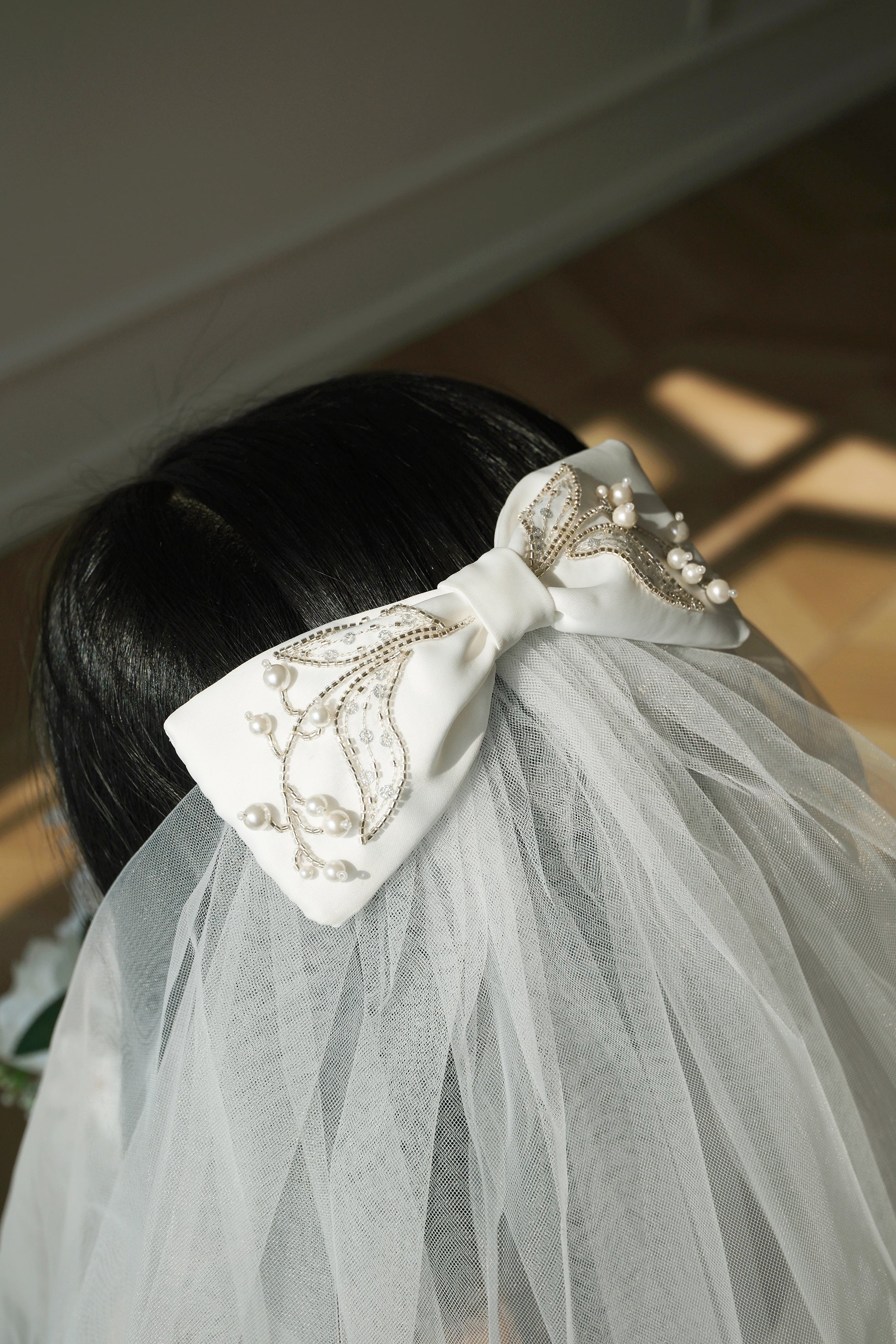 Elevate your bridal look with our exquisite handmade hair bow, featuring delicate pearl and bead embellishments, and a soft, flowing detachable veil. This stunning accessory is designed to add a touch of timeless elegance and charm to your special day.